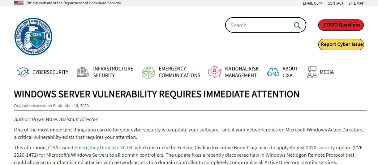 CISA gọi lỗ hổng này là “Zerologon” , kẻ tấn công không cần lấy cắp hoặc sử dụng bất kỳ mật khẩu mạng nào mà vẫn có quyền truy cập vào bộ điều khiển miền. Hacker có thể xâm nhập hệ thống bằng cách sử dụng các thiết bị dễ bị tấn công kết nối với mạng. Khi xâm nhập thành công, hacker sẽ có toàn quyền truy cập vào mạng, và có thể triển khai phần mềm độc hại, ransomware hoặc đánh cắp nội dung nhạy cảm.