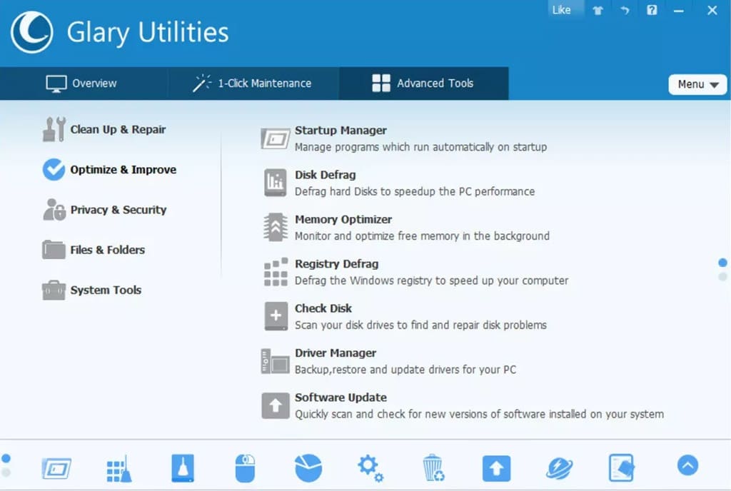 Glary Utilities Pro là một phần mềm tối ưu hóa hệ thống khá toàn diện cho hệ điều hành Windows với nhiều công cụ mạnh mẽ và dễ sử dụng được cung cấp. Nó được thiết kế bao gồm các công cụ hệ thống và tiện ích để sửa chữa chăm sóc hệ thống, tăng tốc độ và duy trì hiệu suất cao cho máy tính làm việc nhanh hơn. Bạn có thể sử dụng Glary Utilities Pro để quét toàn bộ hệ thống máy tính hoặc lựa chọn file/thư mục cụ thể. Chương trình sẽ phát hiện các thư mục không có khả năng truy cập, các phím tắt không hợp lệ, các file khởi động nguy hại trên máy tính, ngoài ra còn có thể xóa bỏ lịch sử truy cập Web, các file Internet tạm thời, cookies, phần mềm gián điệp, phần mềm quảng cáo trong các trình duyệt Web phổ biến. [xem chi tiết về phần mềm tại đây]