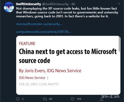 Ngoài ra, mã nguồn của hệ điều hành Windows Serer 2003 cũng rò rỉ có dung lượng 2,9 GB. Thành viên tiết lộ mã nguồn này cũng nói rằng, thực tế, mã nguồn của Windows XP đã được các hacker sử dụng thông qua các kênh riêng tư trong nhiều năm, nhưng đây là lần đầu tiên được phát hành công khai vào hôm nay.