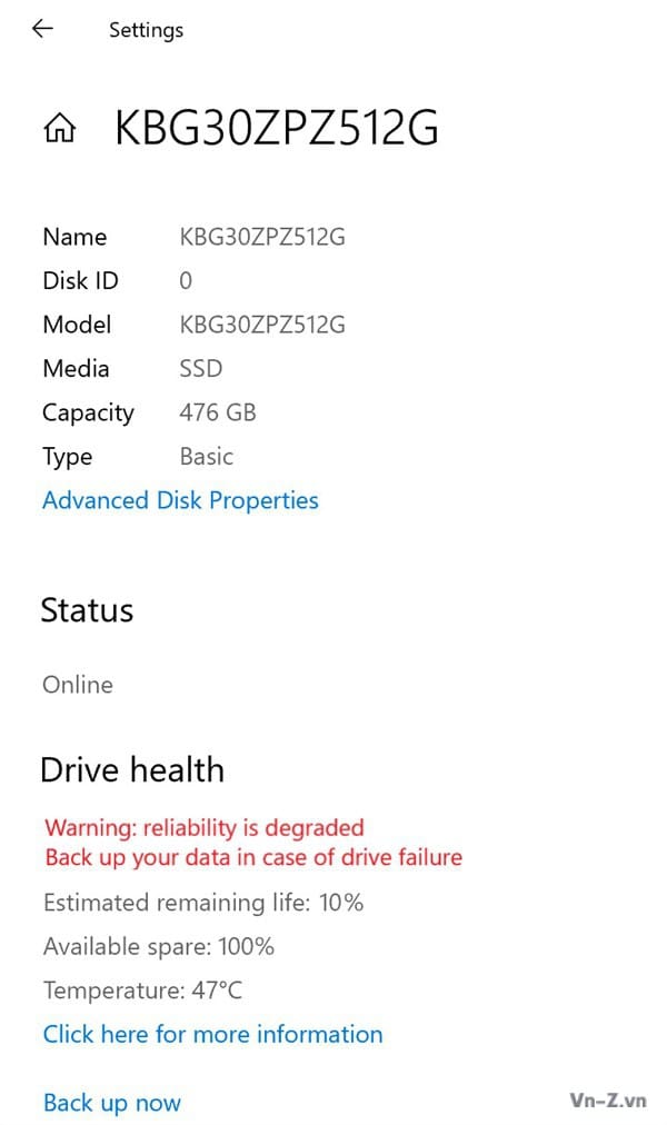 Windows 10 luôn có các hiện tượng đối với ổ cứng HDD và SSD, ngay cả với SDD tình trạngsập ổ cứng khủng khiếp nhất. Sau khi bạn nhấp vào thông báo hệ thống sẽ chuyển đến trang Cài đặt->Hệ thống->Bộ nhớ->Thuộc tính ổ đĩa từ đó cung cấp thêm thông tin hỗ trợ, bao gồm cả tuổi thọ ước tính của SSD.