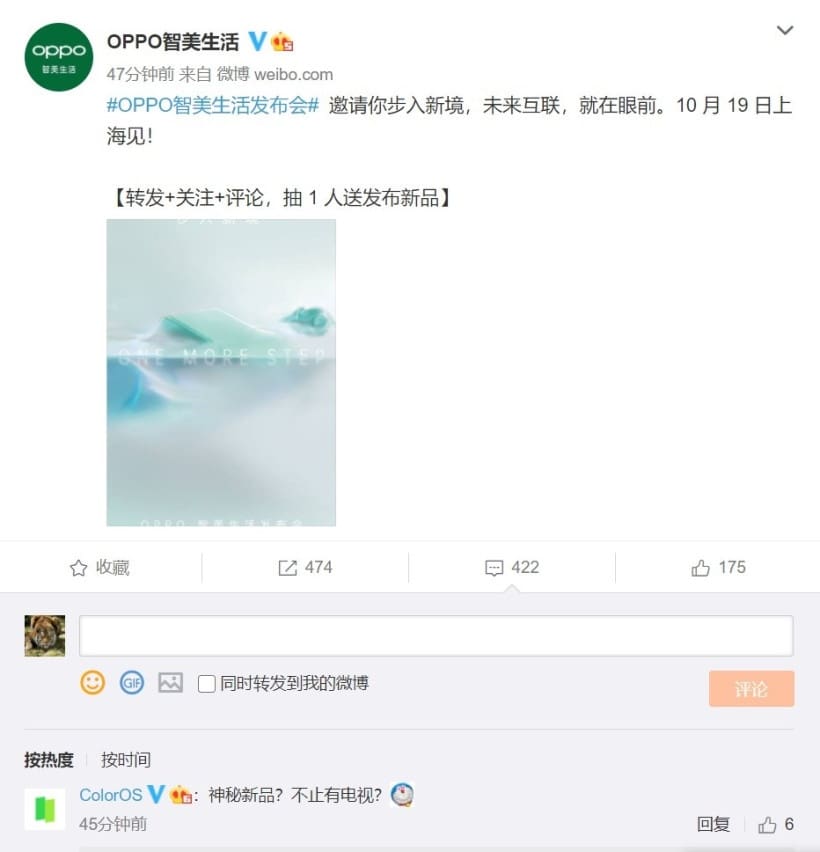 OPPO chính thức chia sẻ một videotrên mạng xã hội Weibo, cuối video đã lộ diện hình ảnh chiếc TV thông minh đầu tiên của OPPO. TV này có thiết kế viền rất mỏng , trang bị mô-đun camera. Thiết kế dạng cửa sổ bật lên, với logo OPPO ở khung dưới của thân máy và giá đỡ TV có màu bạc.